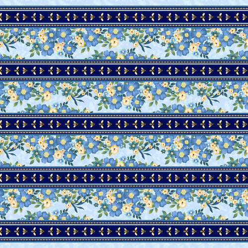 Blue Floral Border Stripe (6950-77) from Bee All You Can Bee by Art Loft for Studio E. Cotton quilting fabric yardage.