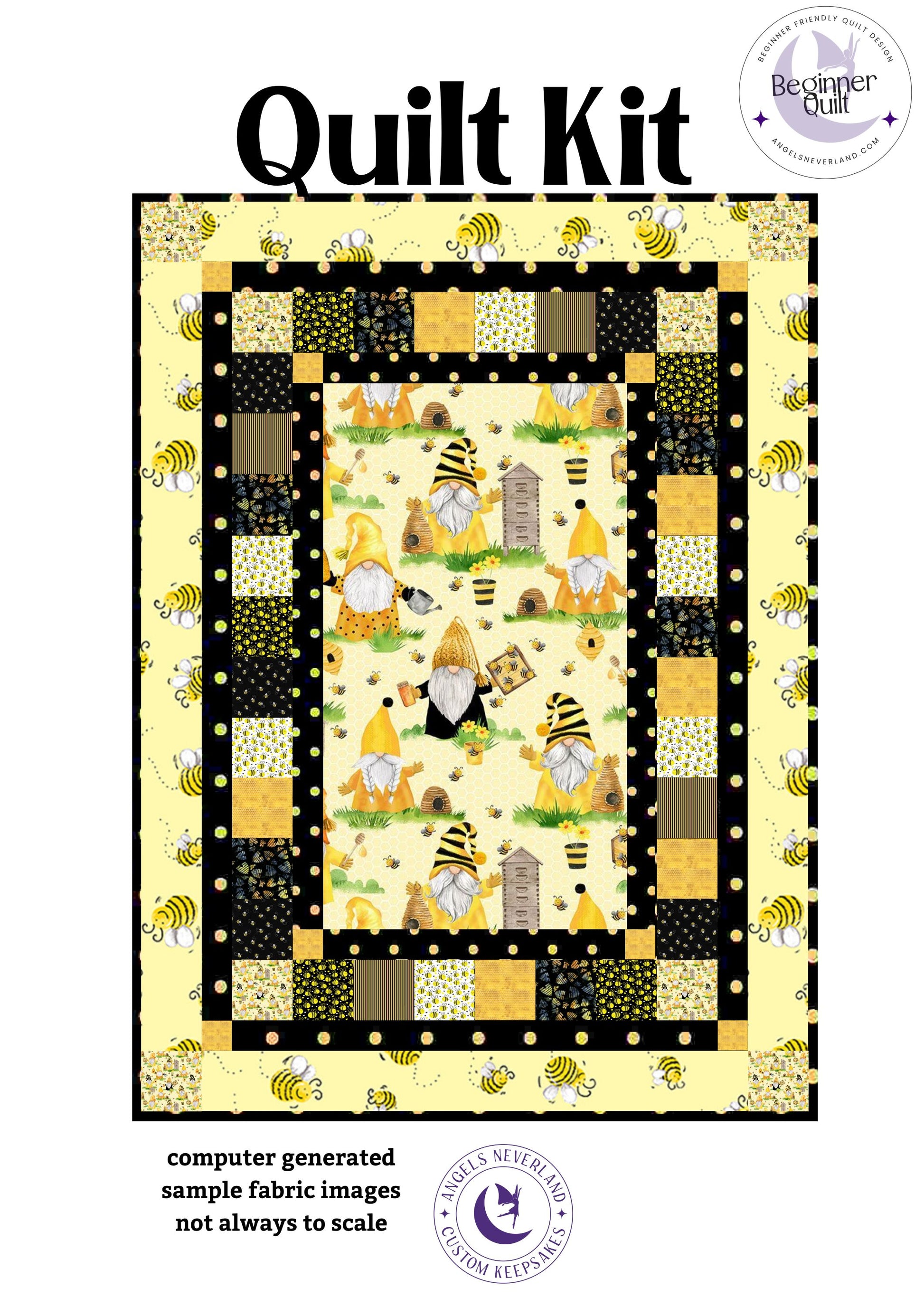 BEGINNER QUILT KIT created with squares and strips using 100% cotton fabric from Timeless Treasures Home is Where My Honey Is Beekeeper Gnome collection along with coordinating collections featuring other bees and hives. Back in stock, while supplies last. Designed with focus fabric Gnome Center. DIY Easy Beginner Quilt Kit. Qualifies for FREE SHIPPING. Sold from a smoke-free and perfume-free environment. Images are computer generated and not always to scale.