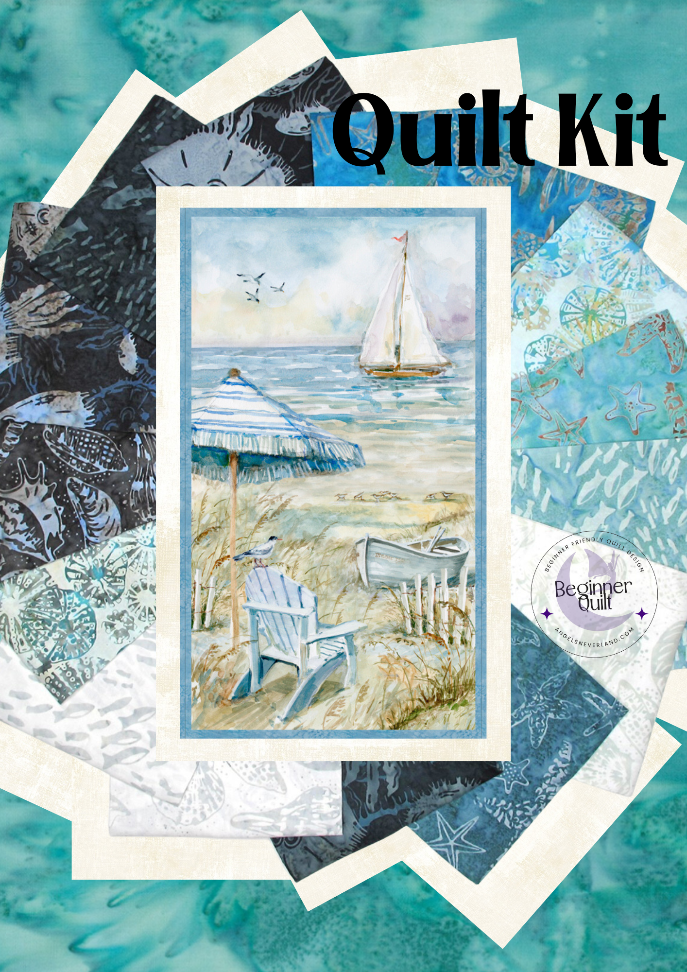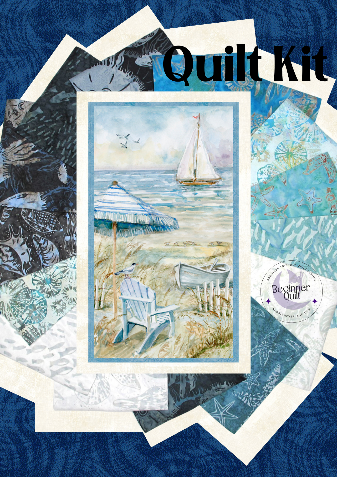 Easy DIY Beginner QUILT KIT with Fat Eighths (cut in 11" x18" size) from Dana Michelle Along The Shores Batik from Hoffman Fabrics. Two colorway choices. Coastal Sanctuary by Susan Winget for Wilmington Prints is a calming coastal sanctuary of quilt shop quality 100% cotton fabric. Colors are sand-tan and sky-water blue. Beautiful panel features a peaceful sailboat on the water and complimenting beach scene complete with beach umbrella.
