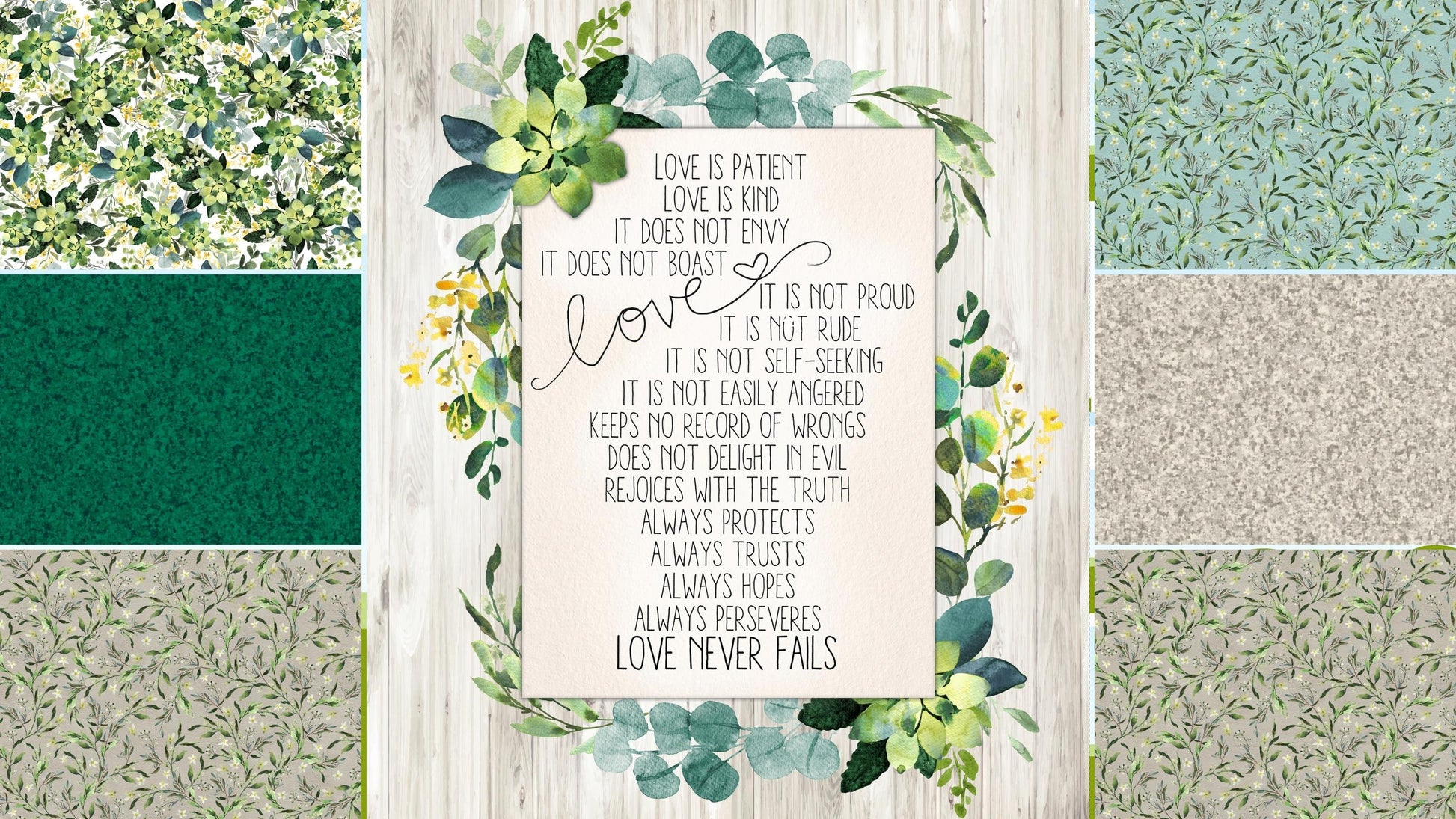 QT Fabrics presents The Love Never Fails Collection by ©Micki Pace Williams. Inspired by the Bible verse Corinthians 13. This lightweight fabric is easy to sew with, has a soft hand, and is very versatile! It is ideal for quilting, but can also be used for crafts, miscellaneous sewing projects, or home décor items like pillow covers and bed skirts.