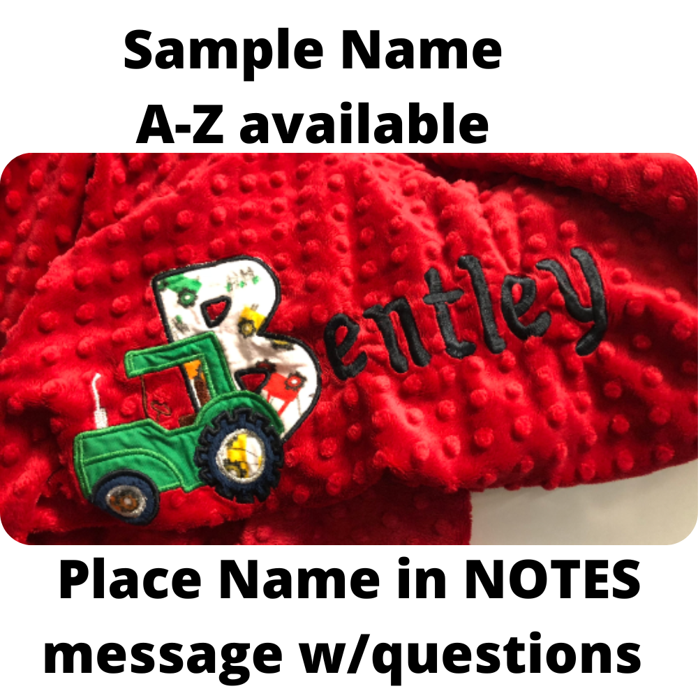 Personalization with child's name, (1st initial applique Tractor Image) A - Z available. Remaining letters of name embroidery font shown (see photos). Please ask if you have questions.