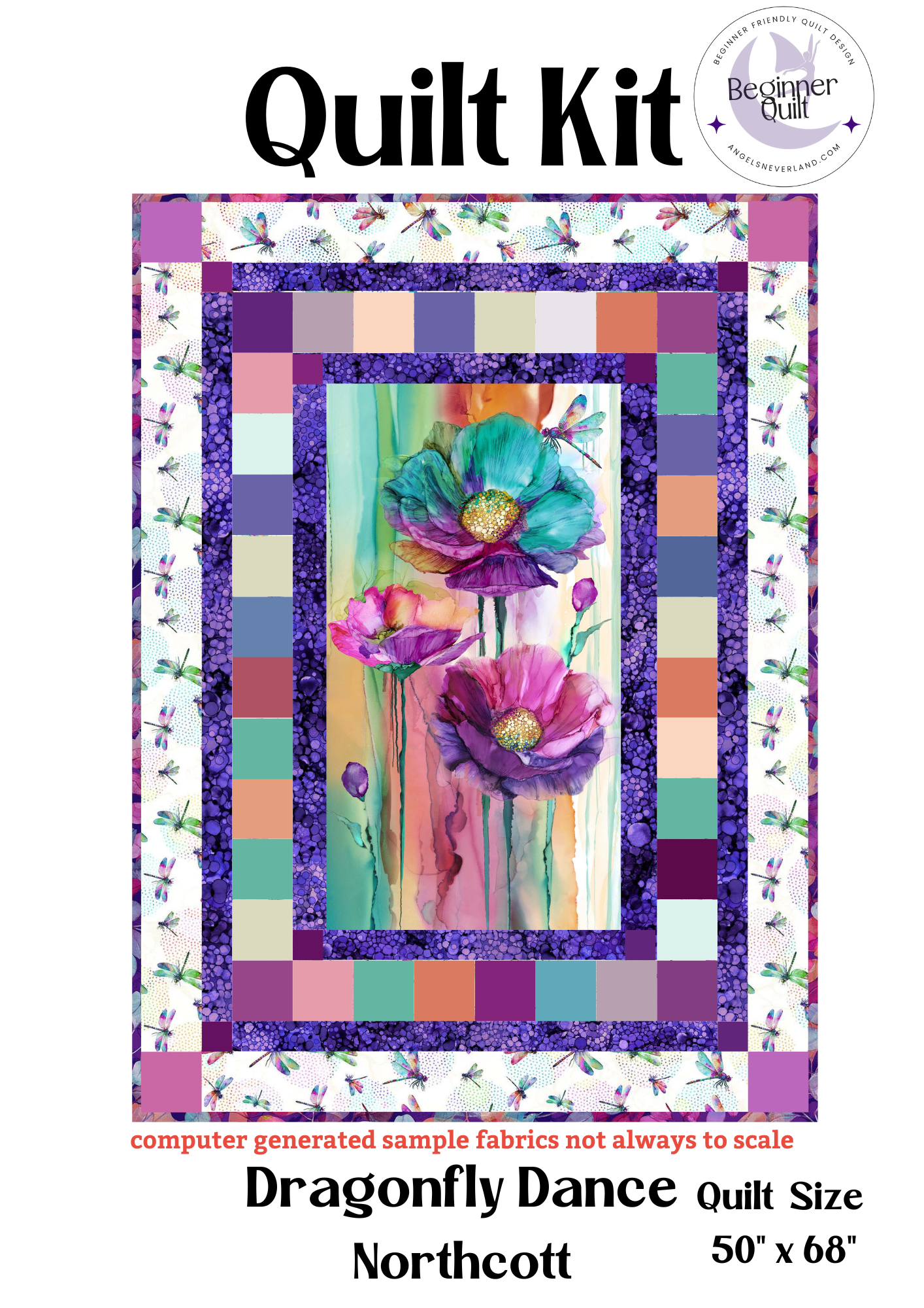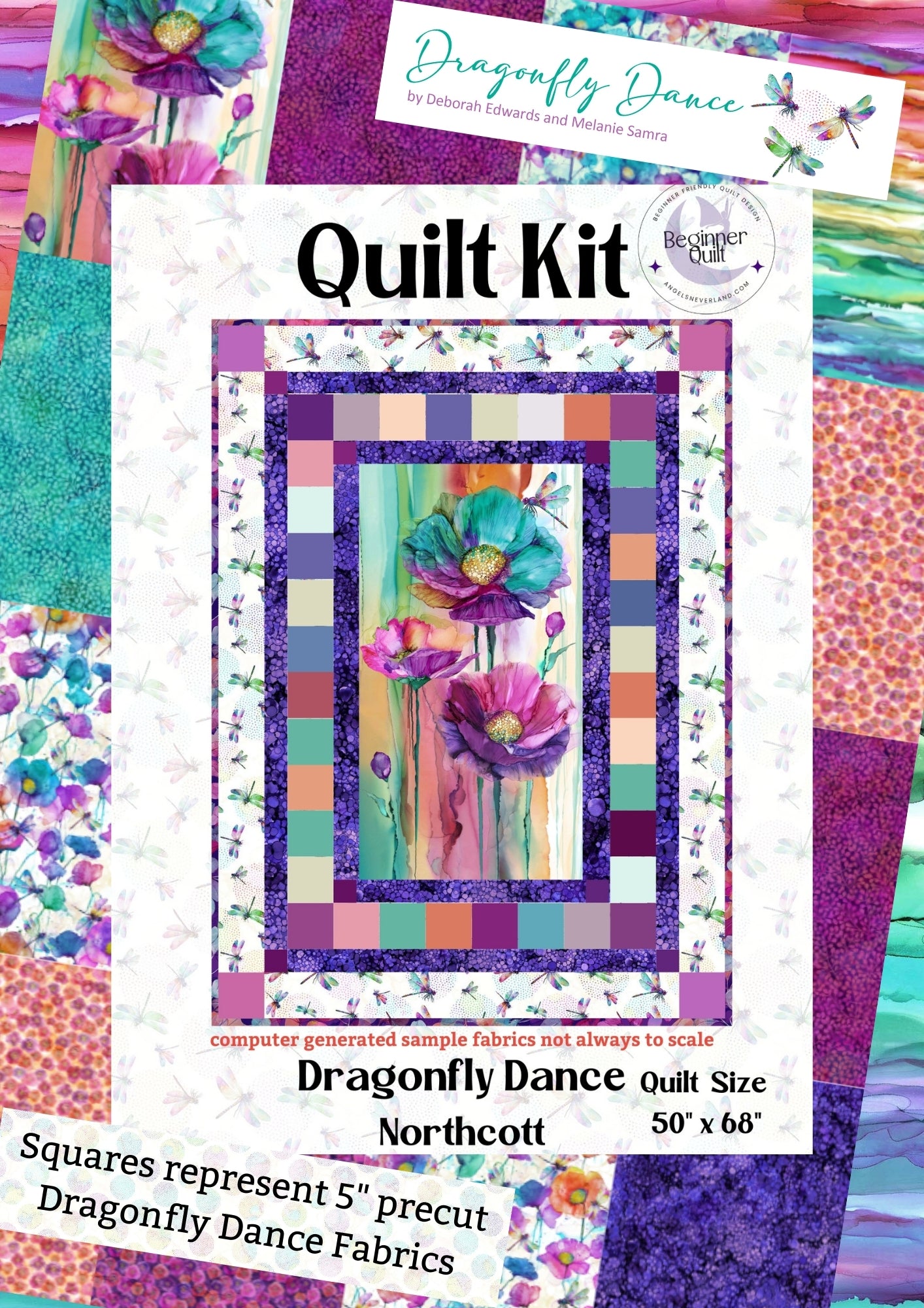 BEGINNER QUILT KIT created with pre-cut 5 inch squares and strips (you cut from fabric yardage) using 100% cotton fabric panel and Chip Precuts (5" precut squares) from Northcott Fabrics, Dragonfly Dance. DIY Easy Beginner Quilt Kit. Qualifies for FREE SHIPPING. Sold from a smoke-free and perfume-free environment. This is the Dragonfly Border Version.