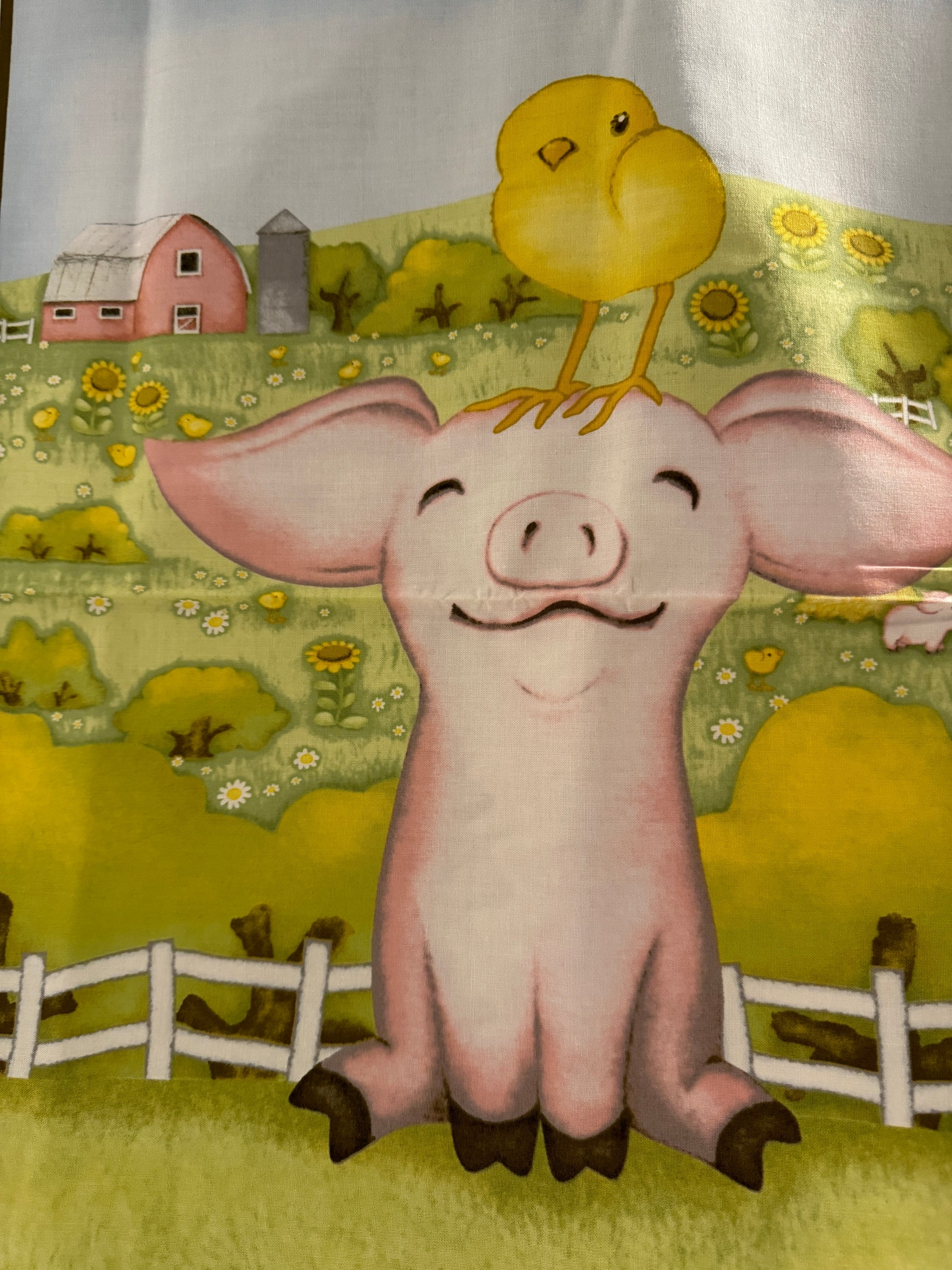 The Panel features a piglet in the center enjoying some time with his baby chick buddy, calves, and a curly lamb. You'll have a farm yard of furry friends to snuggle when you use this fabric bundle to create your next nursery project.