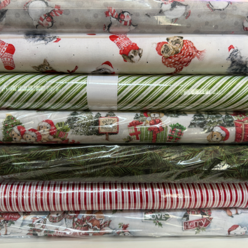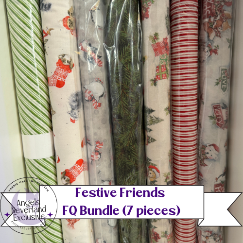 "Festive Friends" FQ Cotton Fabric Bundle an Angels Neverland Exclusive featuring animals ready for winter and Christmas with the perfect Holiday Blenders too! Puppies, Pugs, Penguins, Deer, Owls, and Polar Bears, Evergreen Pine needles, Red and green stripes. The perfect combo for the perfect Holiday Project. Grab this discounted, clearance bundle while supplies last!