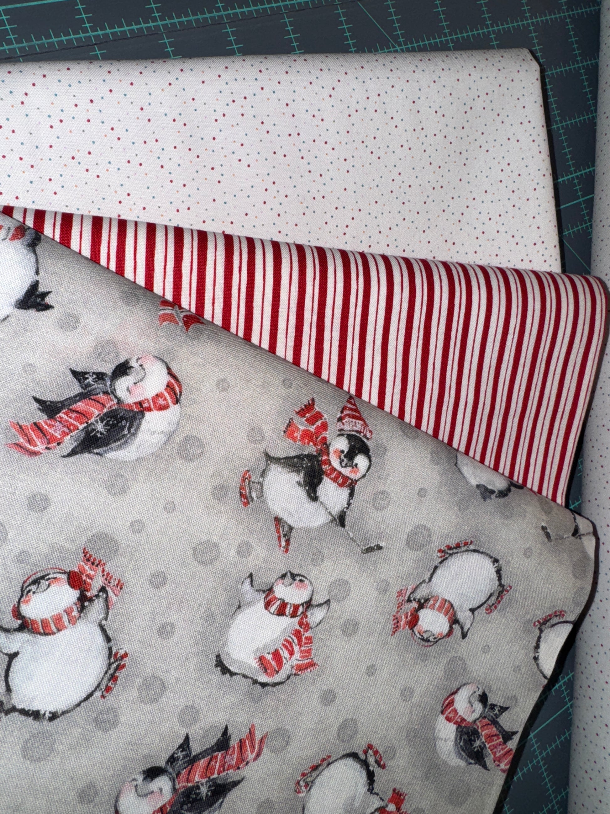 This charming winter bundle brings together playful penguins, classic red-and-white stripes, and a soft snowy polka-dot blender for a festive 3-yard quilt top that’s warm, whimsical, and beginner-friendly.