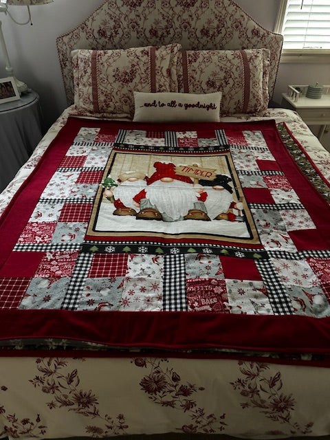 Gnomies PANEL from the Super Cute and Super Soft FLANNEL GNOMIES by Henry Glass. Coordinating fabrics are simply perfect! Thank you to customer, Karen, for sharing her creation with this panel. Stunning! It was a gift for a family member.