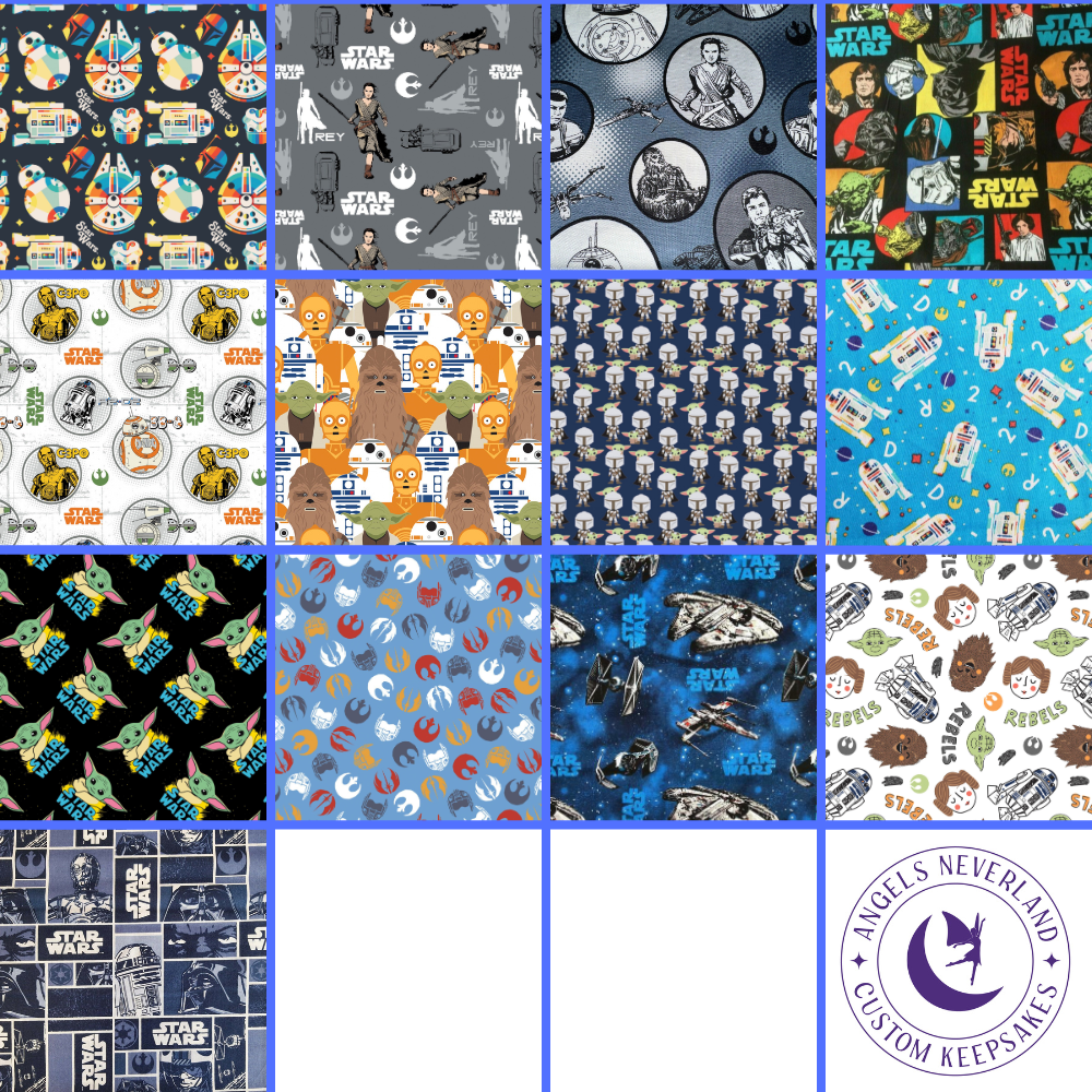 Fabrics feature many of our favorite star wars characters like: Luke, Leia, Han Solo, Chewbacca, BB8, C3PO, R2D2, DO, Yoda Darth Vader, Storm Troopers, Rey, and even "Baby Yoda" and The Mandalorian.