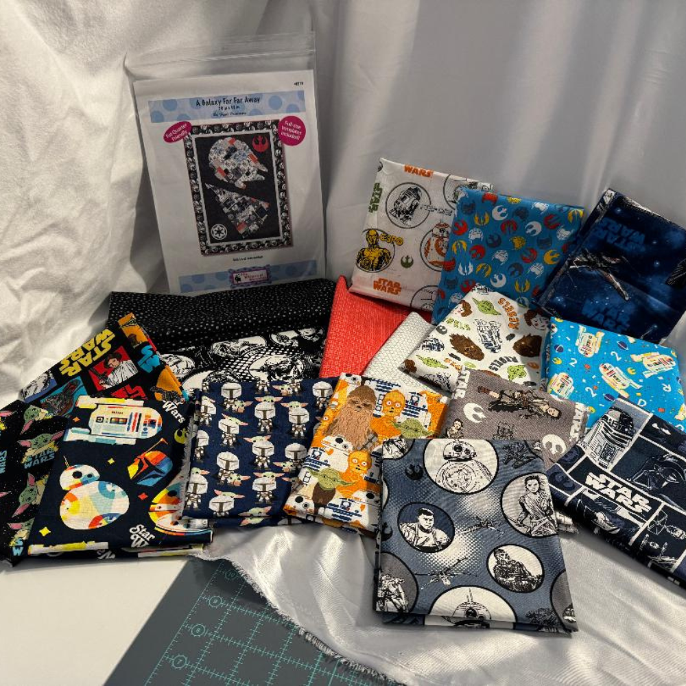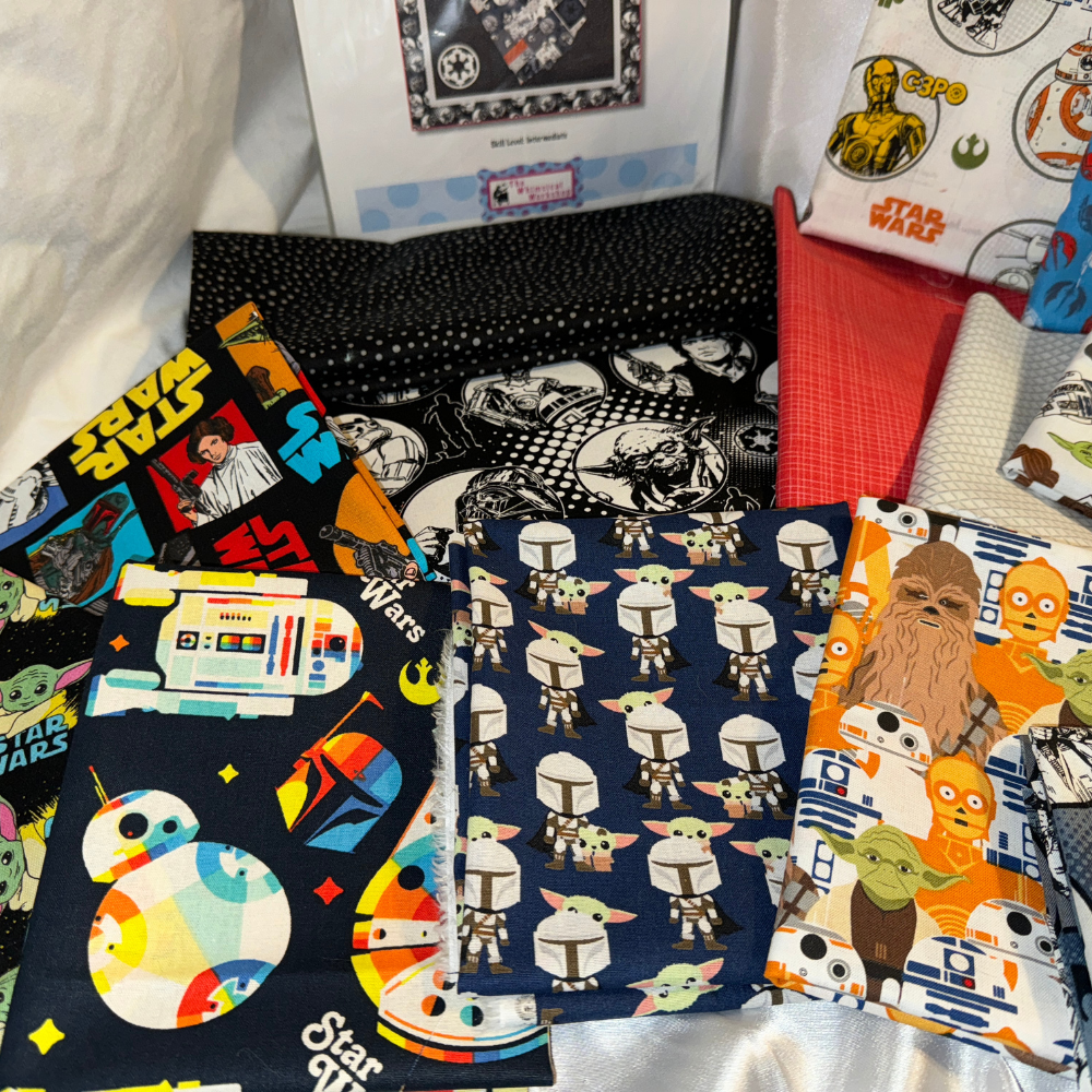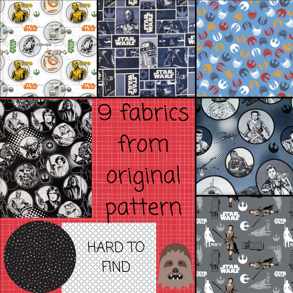 This item does have LIMITED QUANTITIES and Star Wars fabrics will be subbed as needed; however, you will always be able to see the current selection of fabrics in the photos here. This quilt pattern is designed to use FQs for the majority of the project so it is a excellent pattern to use any star wars fabrics you love. ALREADY have your own stash of Star Wars fabrics? Pattern only for sale as well.
