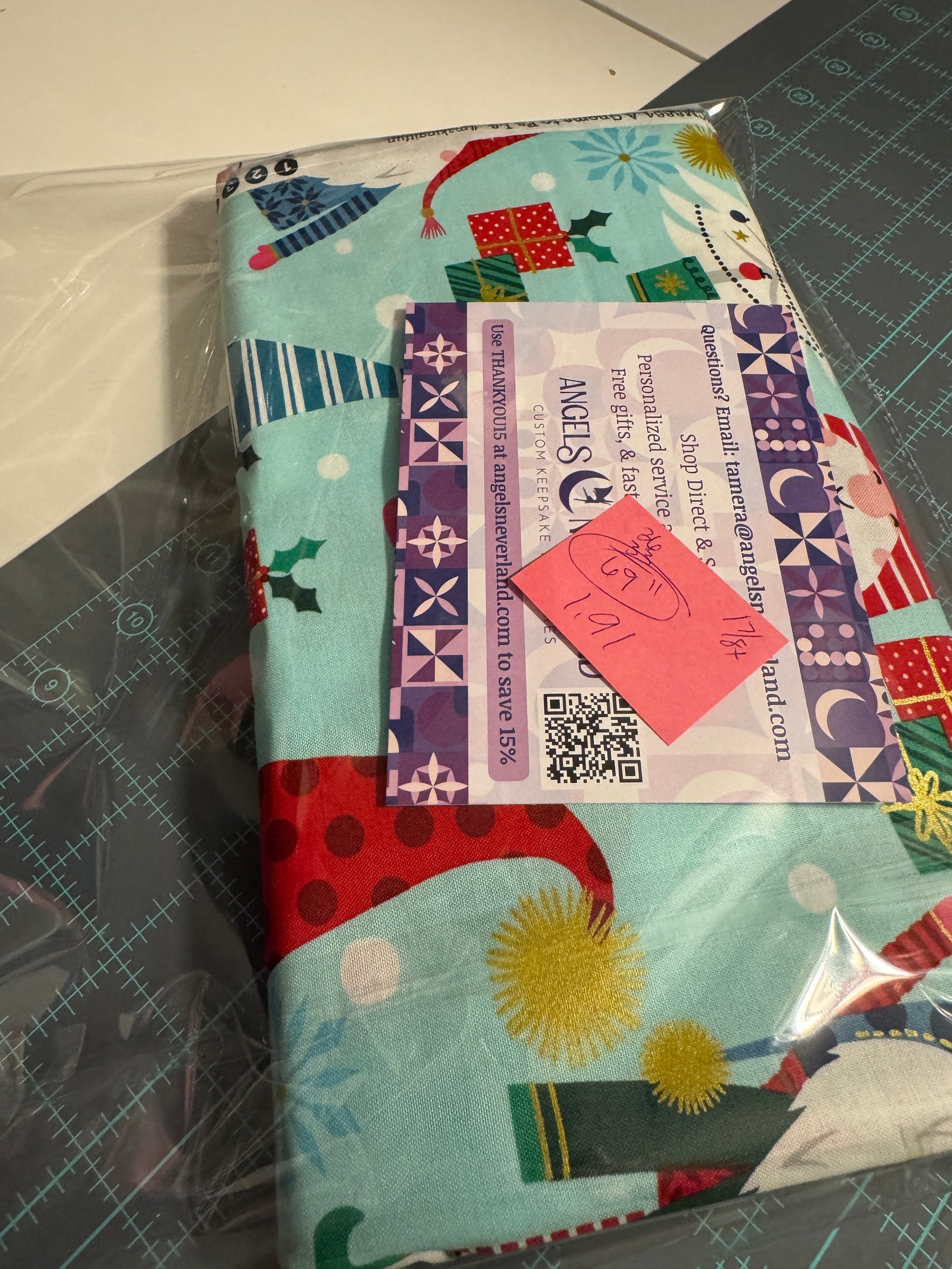 Two LARGE REMNANTS remaining. Piece One: 69" x WOF Piece Two: 71.5" x WOF (almost 2 yards) Aqua blue background featuring gnomes with Christmas Trees and Christmas Packages is from A Gnome to Fa La Collection by Michael Miller. It will get you feeling festive even before the presents are opened! It is simply Fa-La-la-la-lovely! Out of print fabric is available while supplies last and cannot be reordered. This is the last piece in a TWO YARD Cut Size.