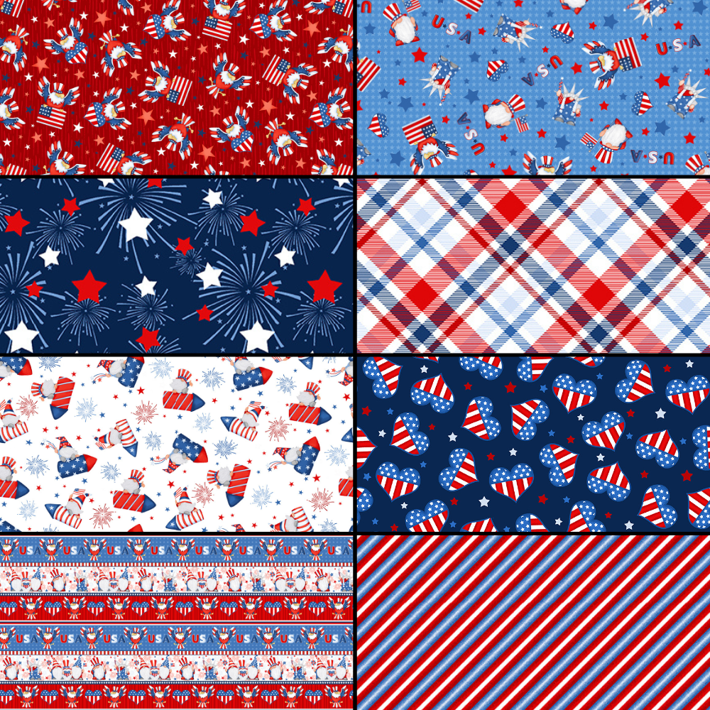 Sassy and patriotic combine in this Shelly Comiskey fabric line. Celebrate patriotism with the Gnome of the Brave Patriotic Fabric Bundle by Henry Glass, featuring 8 prints and a 24" panel with 3 patriotic gnomes, fireworks with large USA.