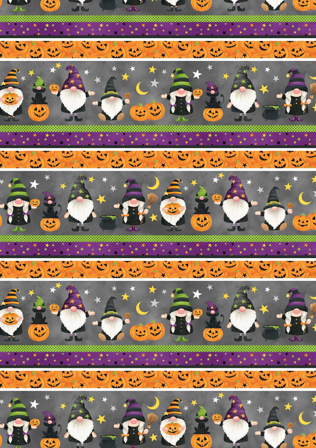 Gnome Border Stripe - Gnomes Night Out Halloween Fabric Collection. Out of Print fabric and hard to find, while supplies last cotton quilting fabric for Halloween.