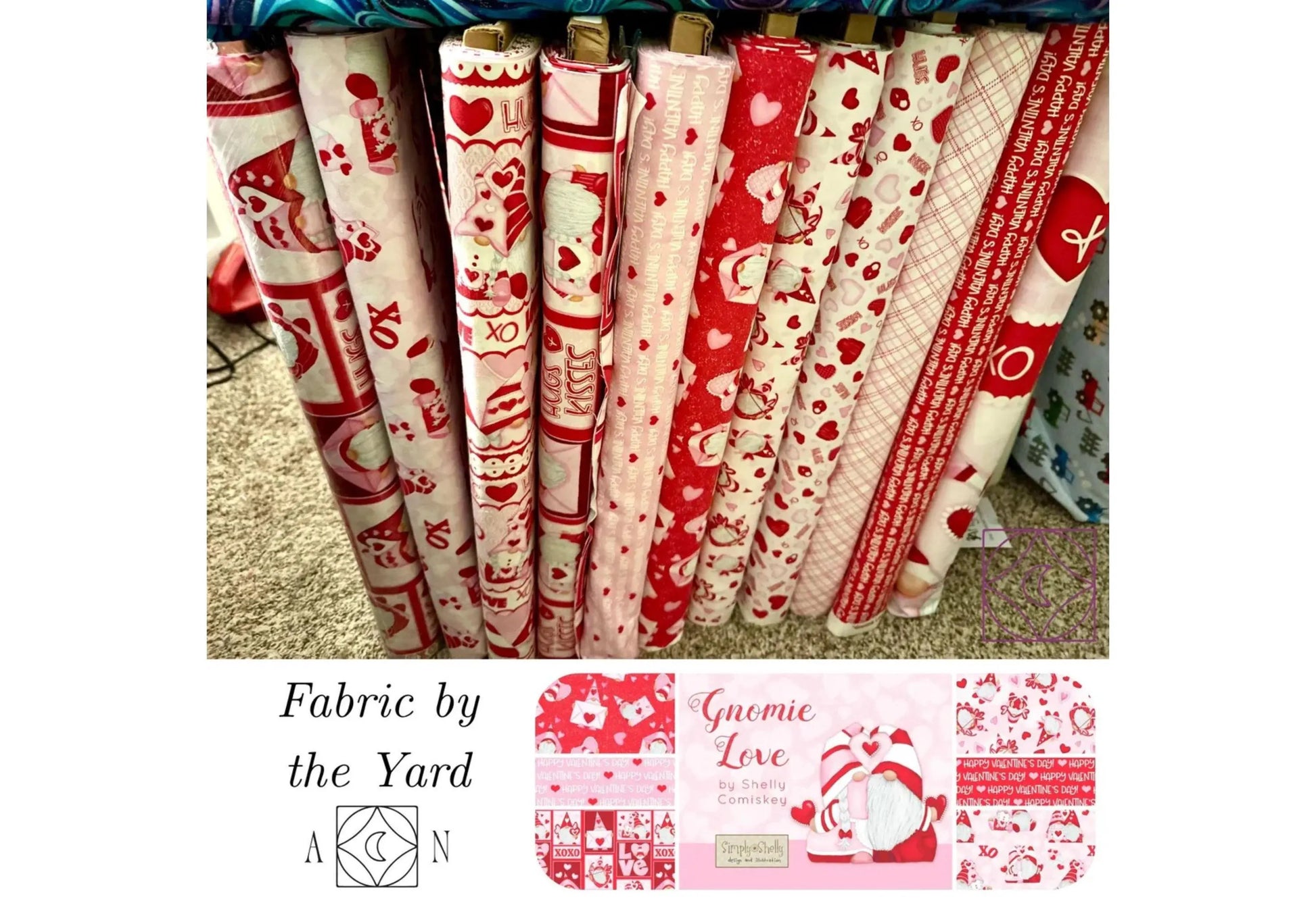Gnomie Love Panel from Henry Glass, 100% Cotton fabric. Other fabrics shown are sold separately by the yard or as bundles.