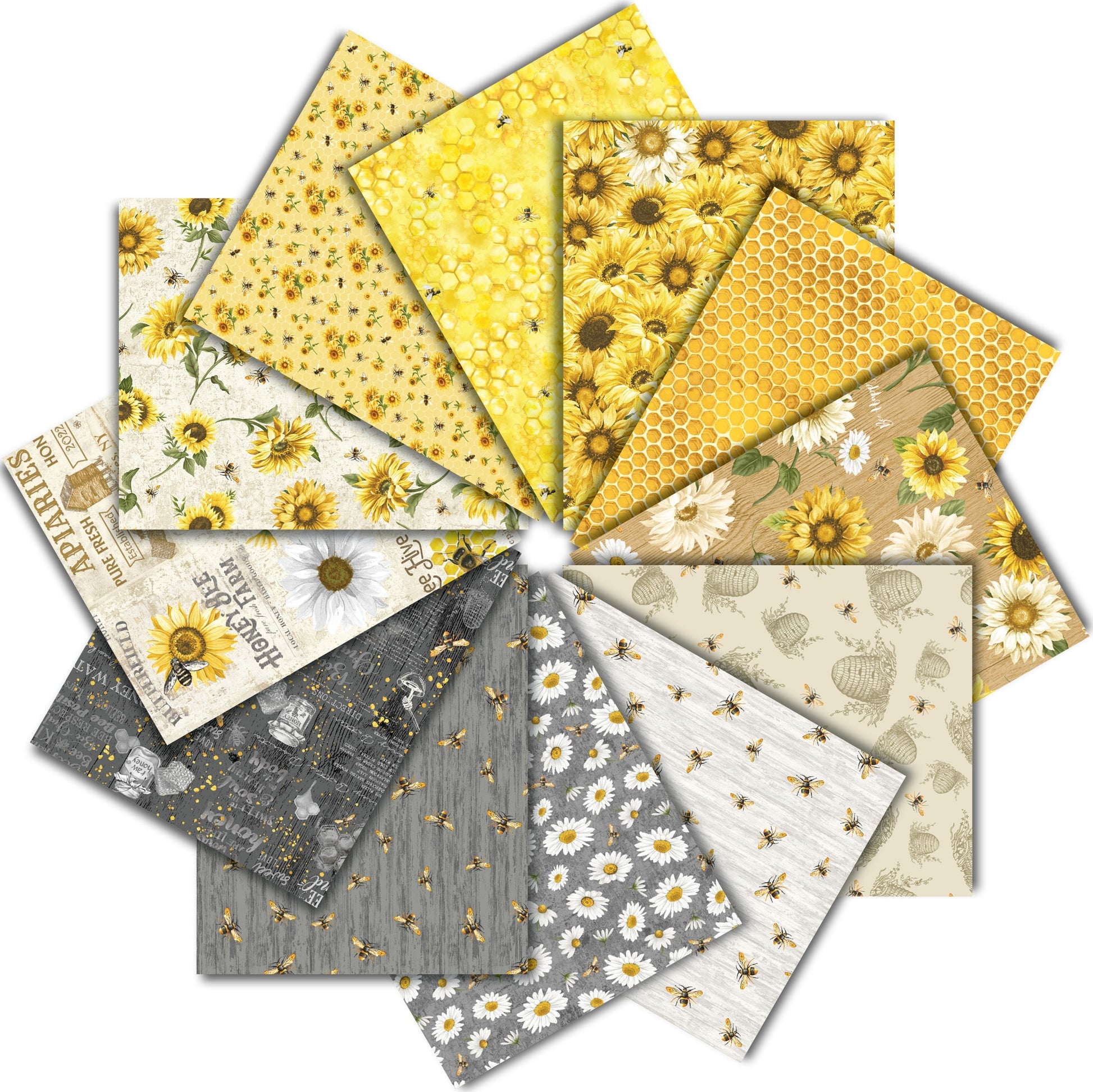 Experience the perfect blend of nature and modern trend with the Honey Bee Farm Fabric FQ Precuts with a spectrum of yellow, golden honey, gray, and white hues, as well as an assortment of sunflowers, daisies, and bees. Let's create something beautiful!