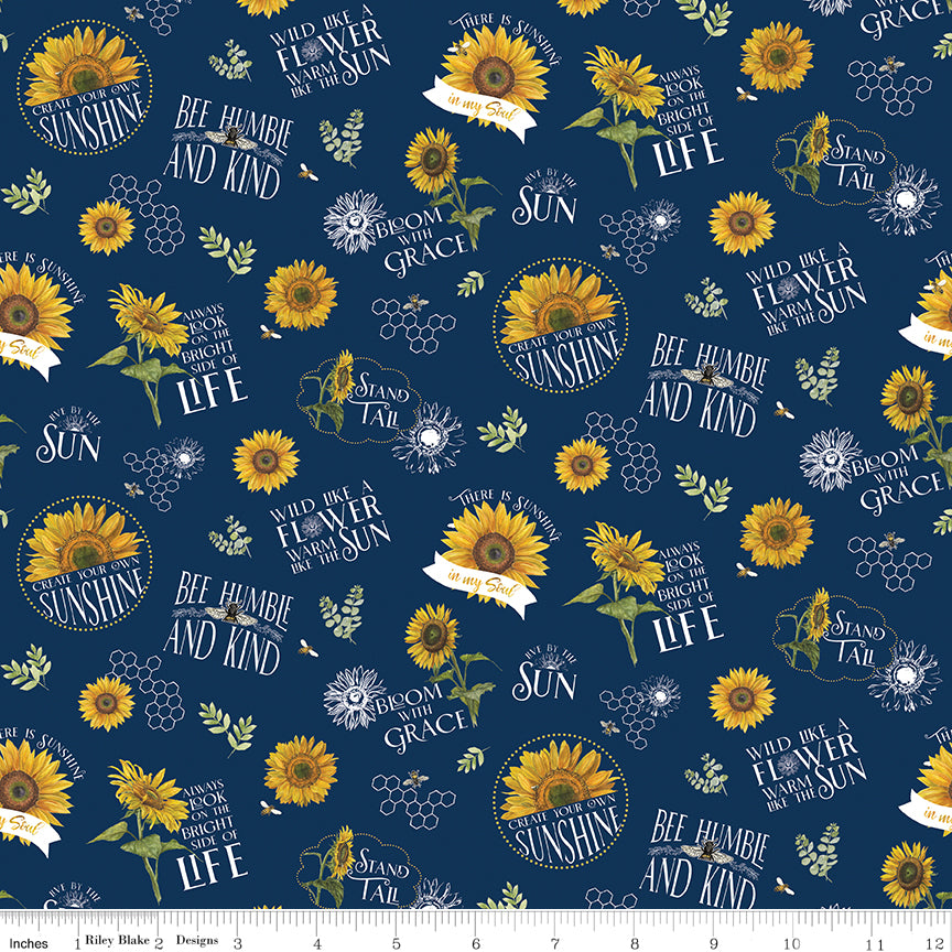 Honey Bees & Flowers Please Main Print in Navy (C15130) sold by the yard. Designed by Tara Reed for Riley Blake Designs is a breathtaking collection inspired by yearly visits to a sunflower farm! Enjoy "the beauty and synergy that exists between the majestic sunflowers and noble bees" (Tara Reed) in this new collection! It is perfect for quilting, home décor, apparel and any floral and bee projects you are dreaming of crafting.