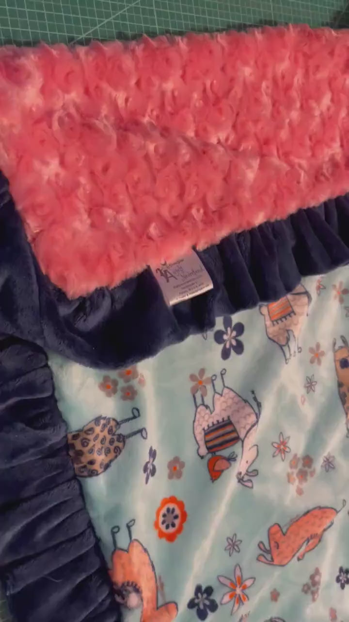 One of a Kind Llama Lovey Reversible Luxe Coral Rose Cuddle Minky Blanket with Navy Minky Ruffle 33" x 23"