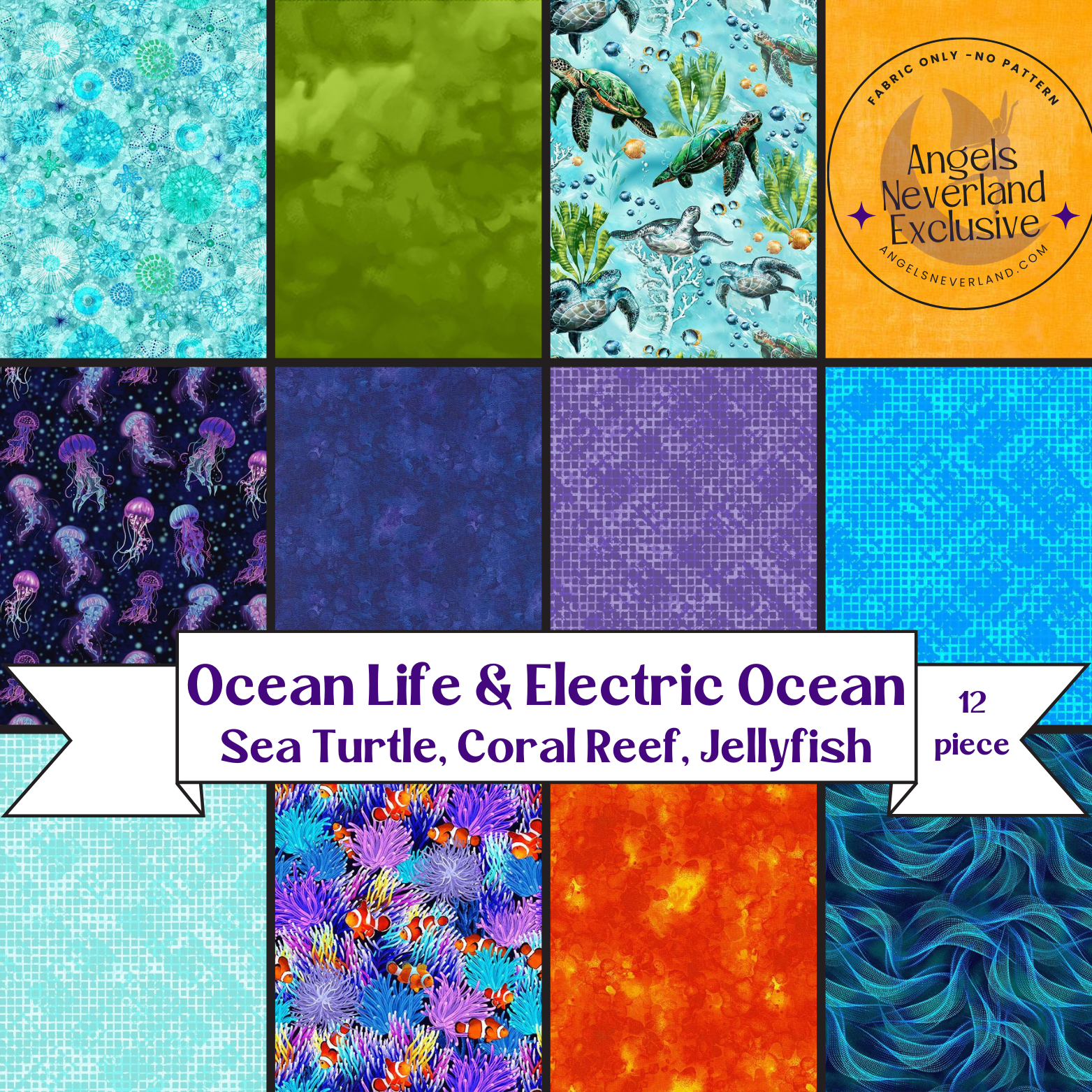 An exclusive FQs fabric bundle cut and curated by Angels Neverland includes 12 FQ cuts of fabric. Superior color matching to save you time. Pair it with a digital download pattern from Villa Rosa or just build your fabric stash. You won't want to miss out on these vibrant ocean colors so swim over and grab some for your shopping cart today! This bundle combines the fabrics of our Ocean Life Electric Jellyfish Bundle, Ocean Live Sea Turtle & Electric Ocean, and our Ocean Life Coral Reef & Sea Diatoms bundle.