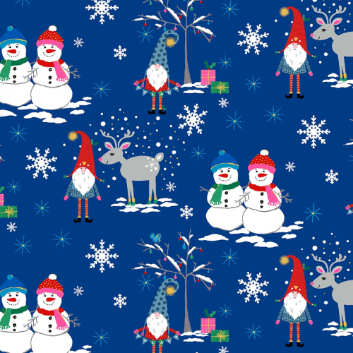 Royal blue background featuring a snowman couple, reindeer and gnomes with snowflakes. A Gnome to Fa La will get you feeling festive even before the presents are opened! It is simply Fa-La-la-la-lovely!
