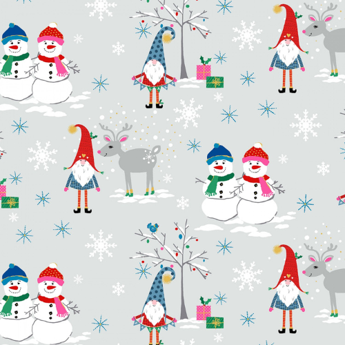 Grey background featuring a snowman couple, reindeer and gnomes with snowflakes. A Gnome to Fa La will get you feeling festive even before the presents are opened! It is simply Fa-La-la-la-lovely! Also available in a royal blue colorway.