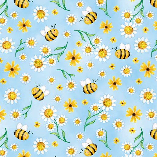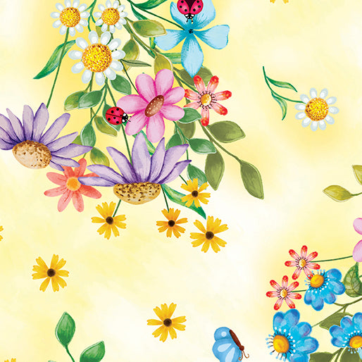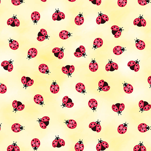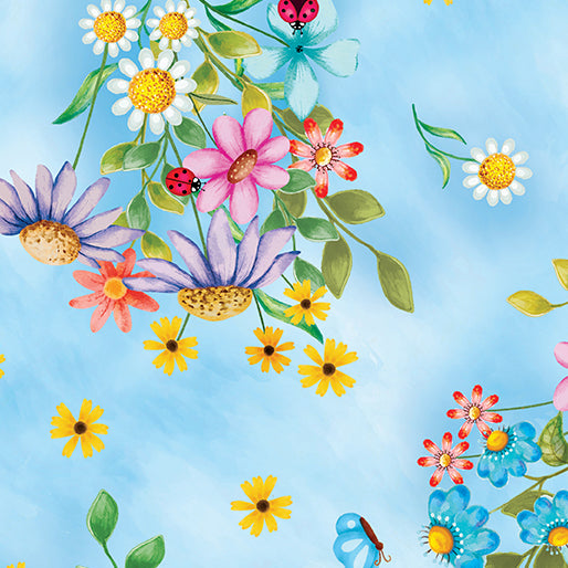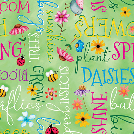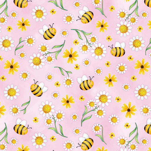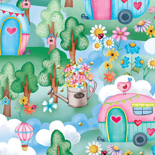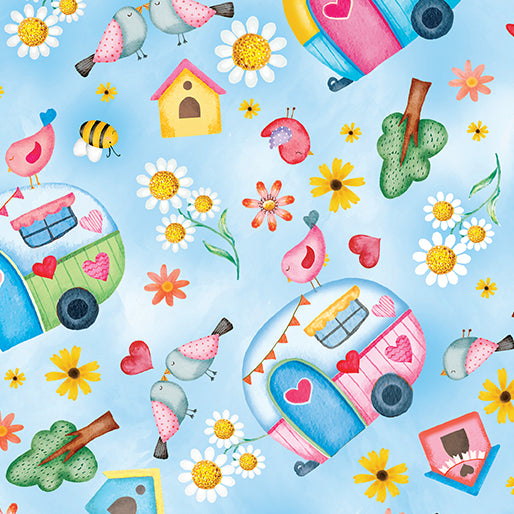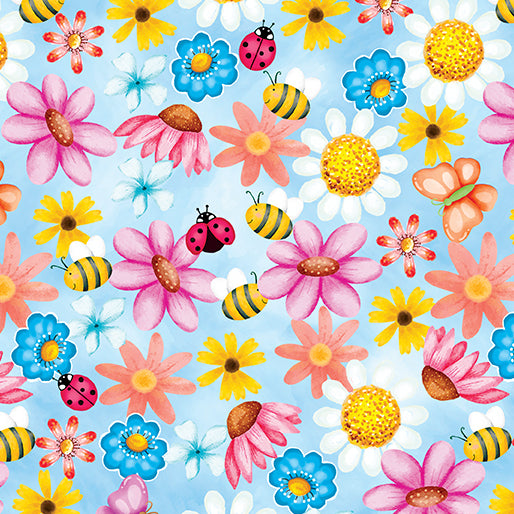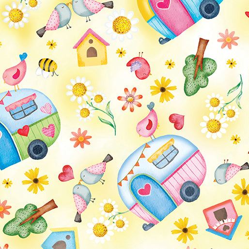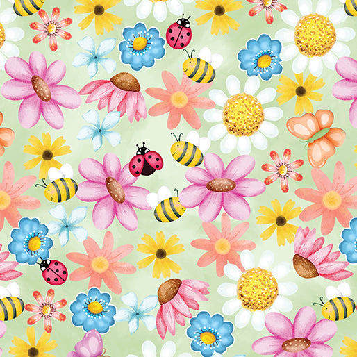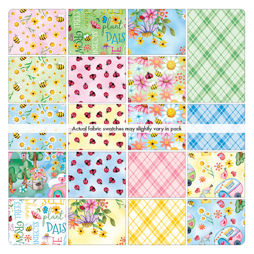 Daisies, bees, lady bugs, bias plaid and cute little campers in bright pastels of pink, blue, yellow and green
