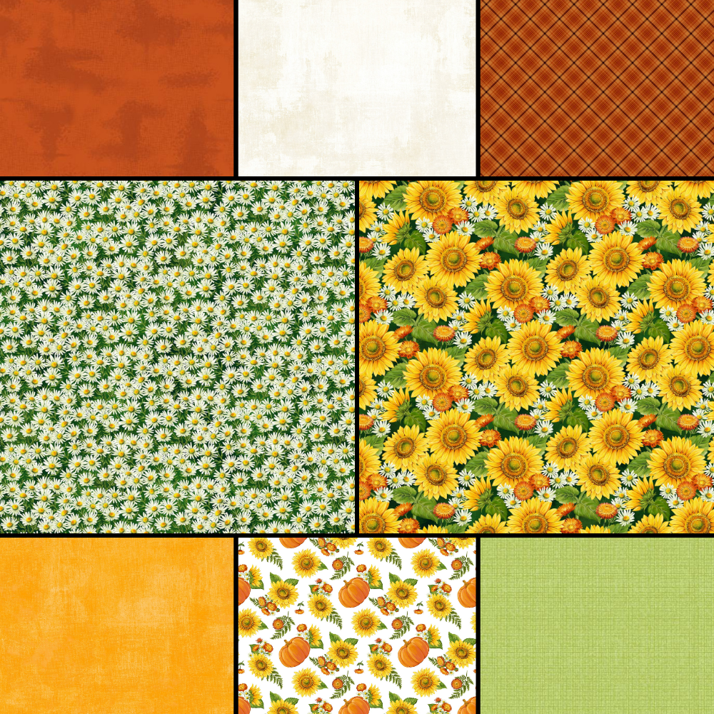 Wrap yourself up in this sunny and cheerful Sunshine Harvest floral fabric bundle, choose from FQ, 1/2 yard and 1 yard sizes. You receive one cut of each fabric shown in your choice of size.
