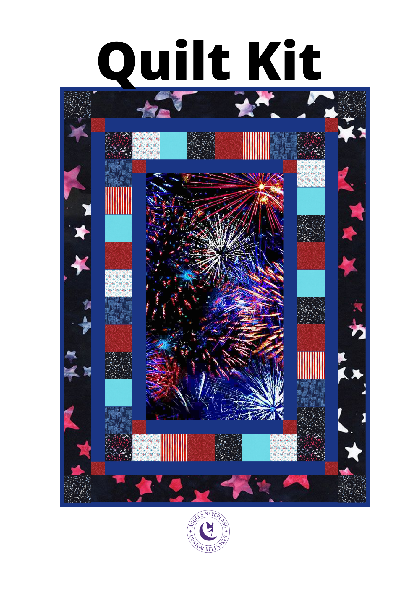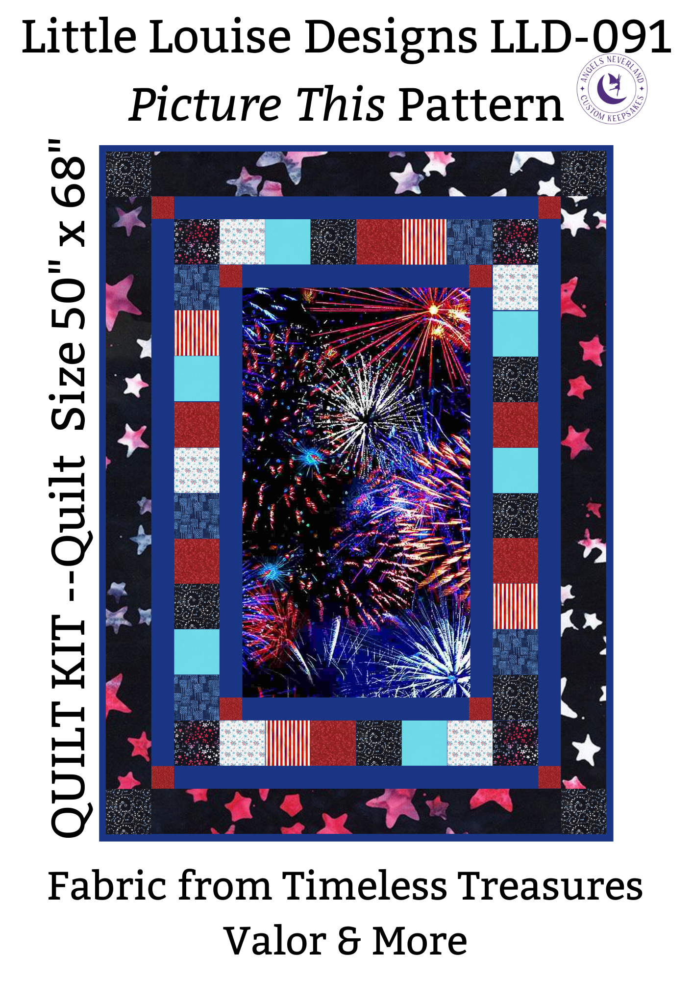 Our Patriotic Timeless Treasures Valor and More Easy DIY Beginner QUILT KIT is perfect to make your own special quilt. Featuring Timeless Treasures fabrics in stars, stripes, fireworks and more, 100% Cotton and Picture This Pattern by Jude Spero, you'll have everything you need to make a patriotic quilt TOP featuring lots of stars, stripes, and fireworks. The best part? It's Angel Neverland's top selling QUILT KIT pattern. Everything included to complete the TOP and BINDING of your special Patriotic Beginner Quilt.