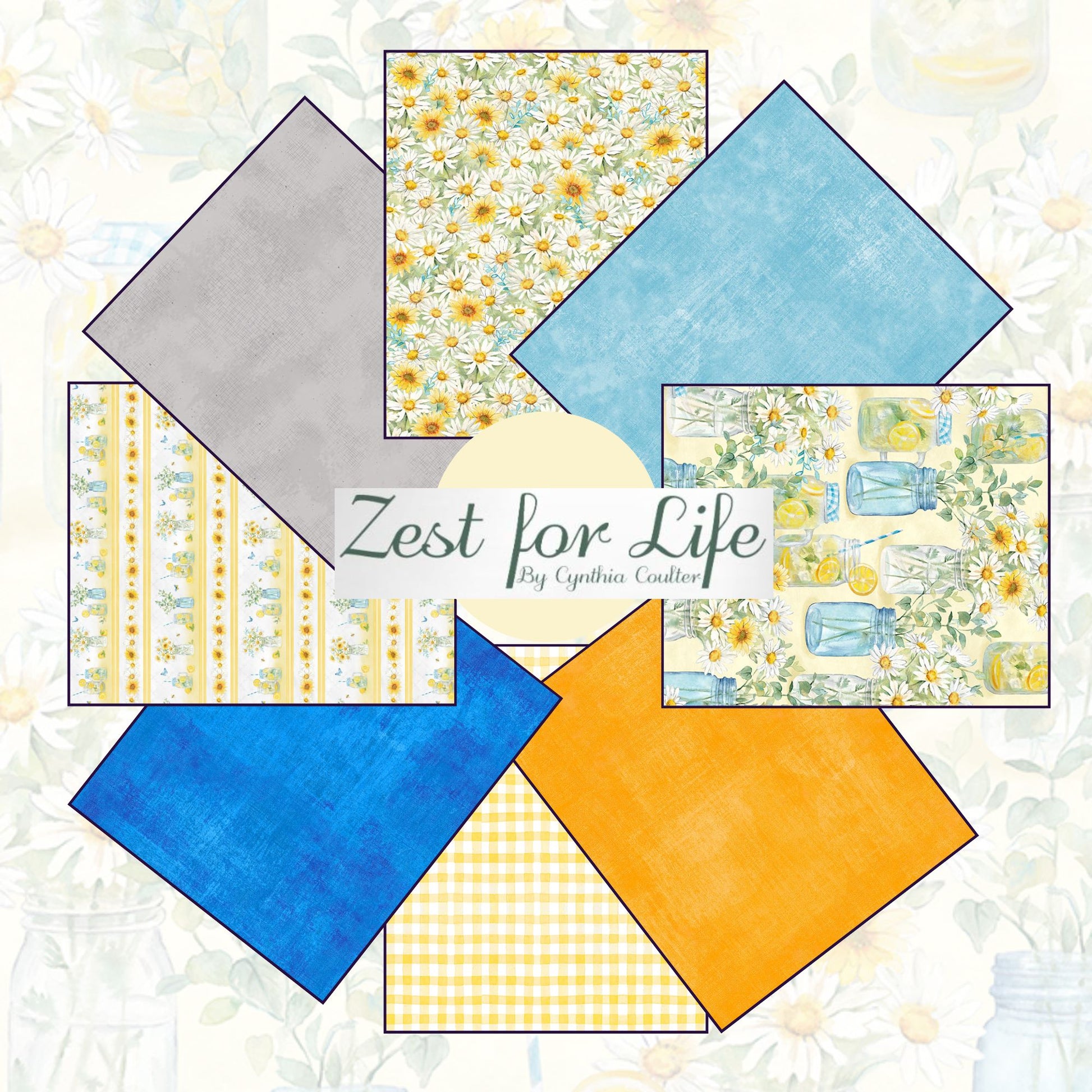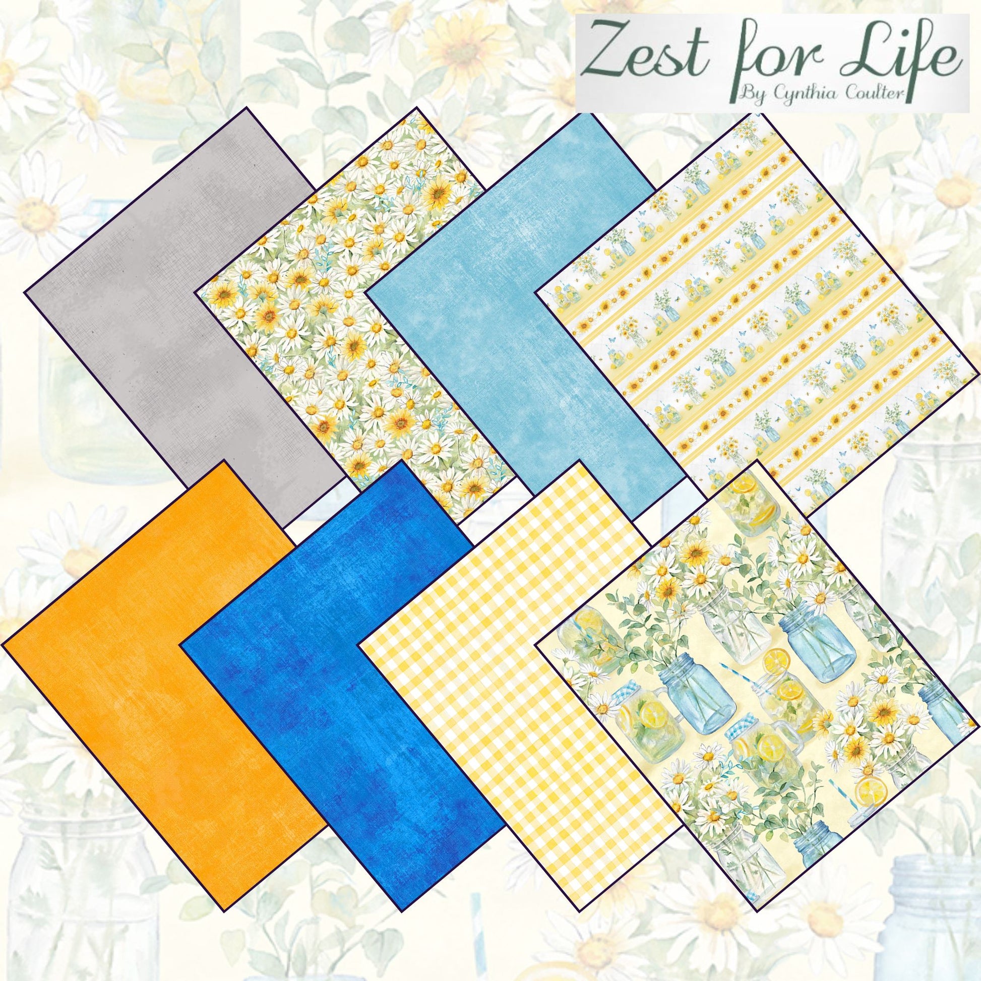 Shop all of the Zest for Life Collection with Bundles, Quilt Kits, and other kits (aprons, placemats, and tote bags) with its beautiful coordinating prints with daisies, lemons, and butterflies, and solids in blues; you won't be disappointed.