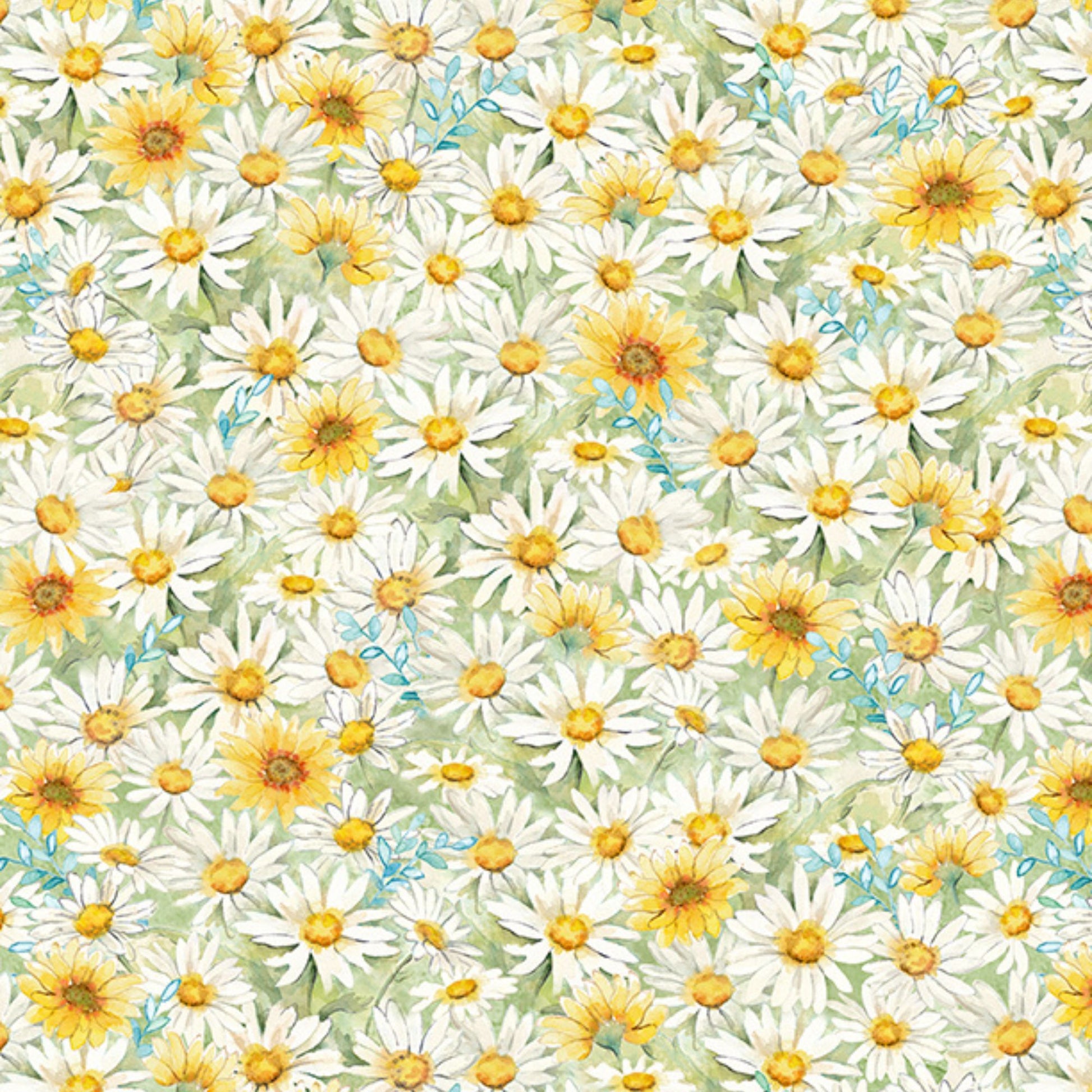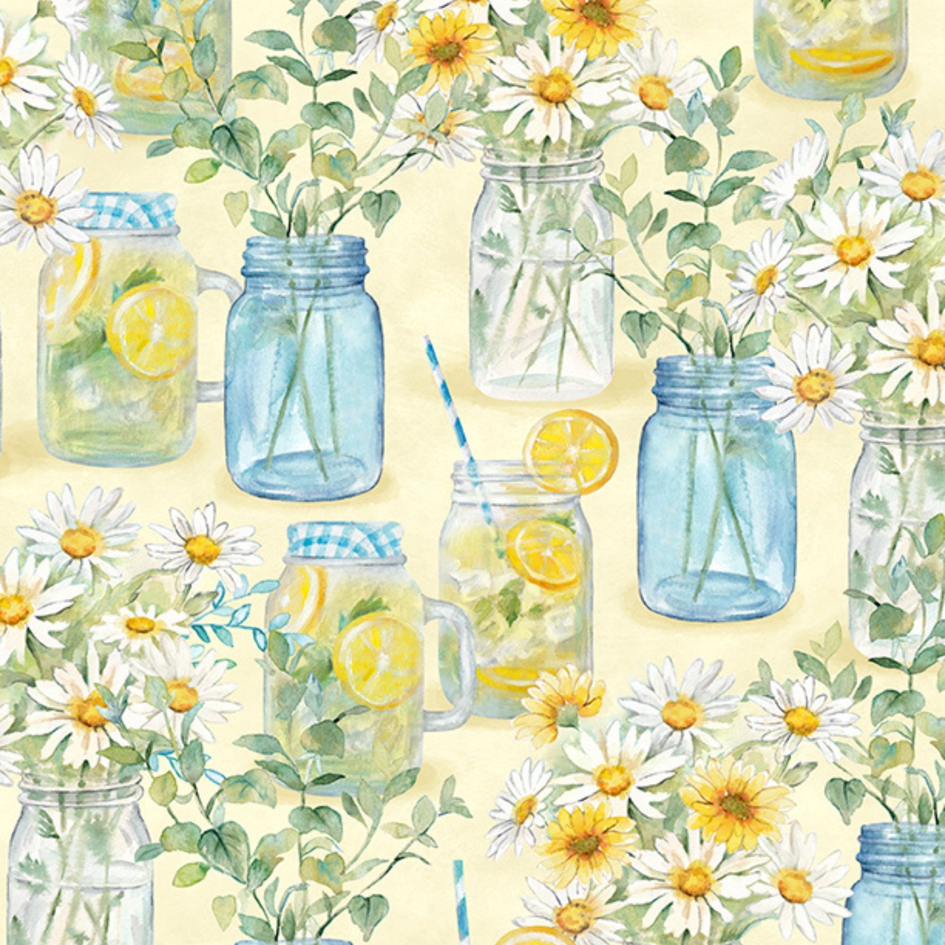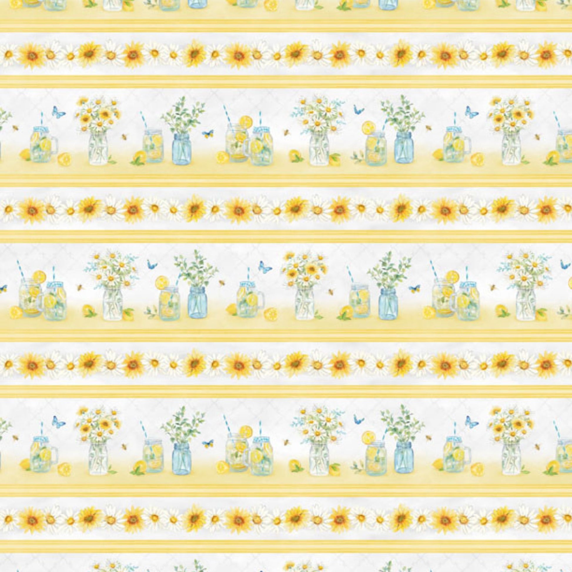 Zest for LIfe is by Wilmington Prints Cotton Fabric Collections by Cynthia Coulter- bundle includes the repeating multi-stripe, glass mason jars with lemons and lemonade, yellow and white daisy chains, floral designs with cut daisies, and flittering butterflies and the floral design. Blender fabrics in drybrush, shabby gray (Riley Blake) and yellow gingham. (8 prints in all cut in 1/2 yard pieces)--order TWO and receive FULL YARD cuts.